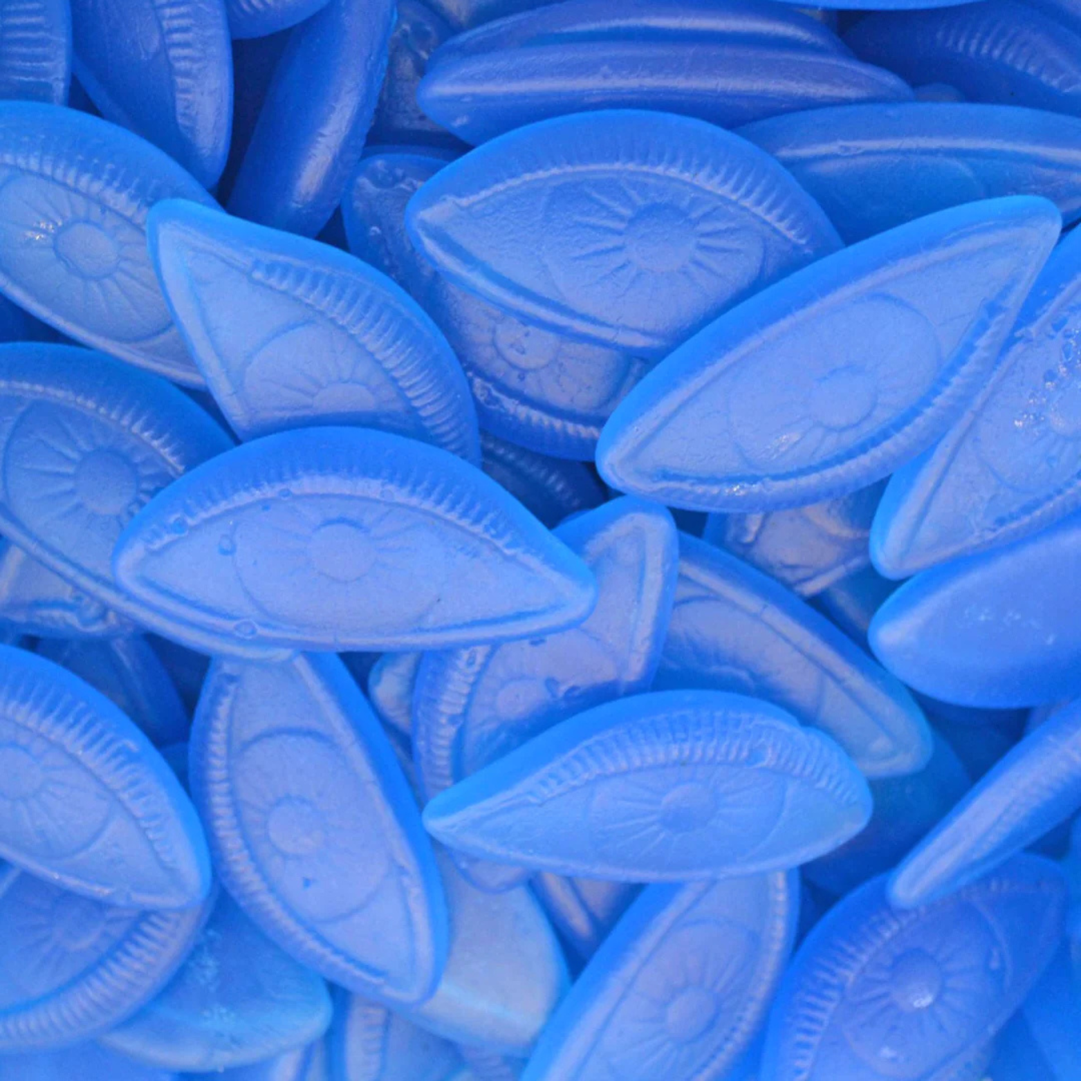 Skåne Konfektyr Blåöga – mjuka och sega gelégodisar med fruktig bärsmak och en rolig blå ögonform. Glutenfri enligt recept (kan innehålla spår). Innehåller gelatin och är därför ej veganska. Ej ekologiska. Ett lekfullt och populärt godis för både barn och vuxna.