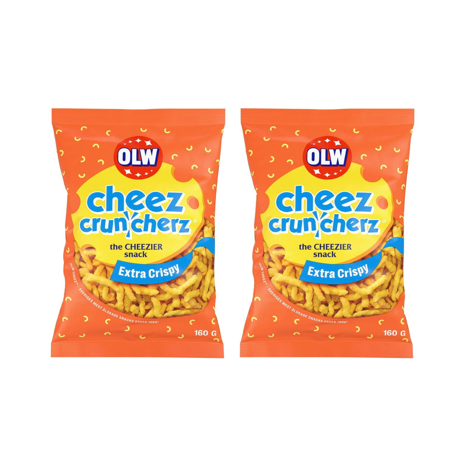 Krispiga Cheez Cruncherz Extra Crispy från OLW. Svenskt ostsnacks med extra crunch – perfekt till fredagsmyset eller som en godbit när som helst!