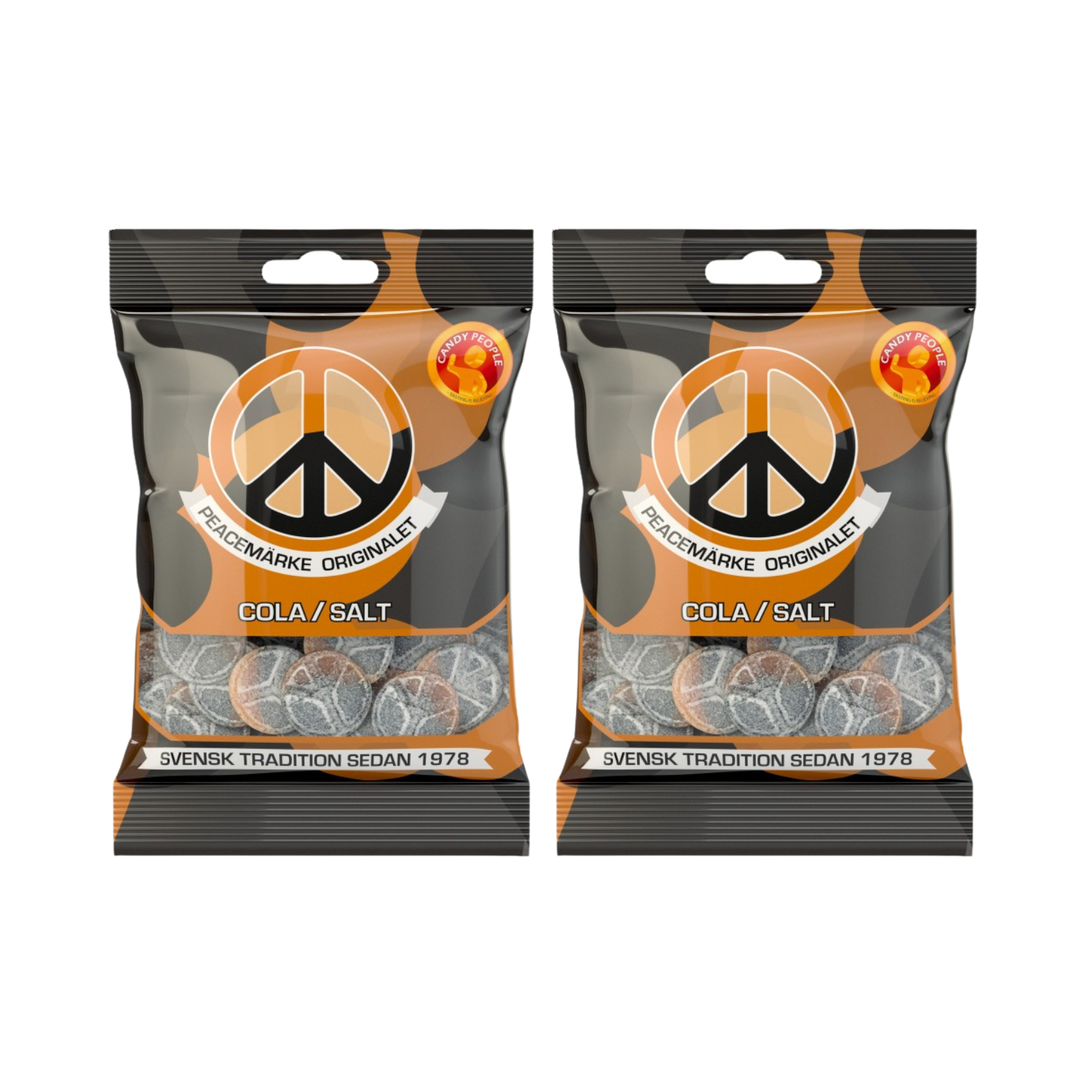 Candy People Peacemärke Cola/Salt – en 80g påse med segt och smakrikt godis i fredsmärkesform. Frisk colasmak möter salt lakrits i detta populära gelatinfria godis.