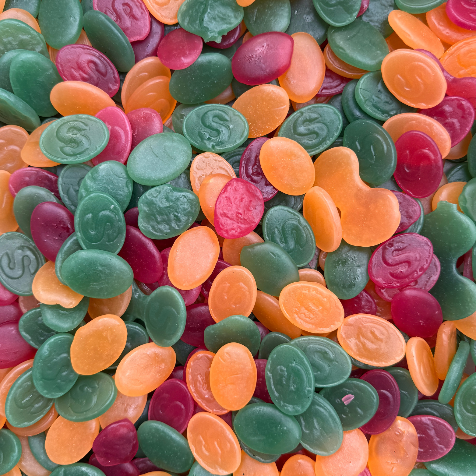 S-Märke Frukt är en älskad svensk klassiker med mjuka, syrliga godisar i en mängd olika djärva fruktiga smaker som jordgubb, citron och päron. Socker.