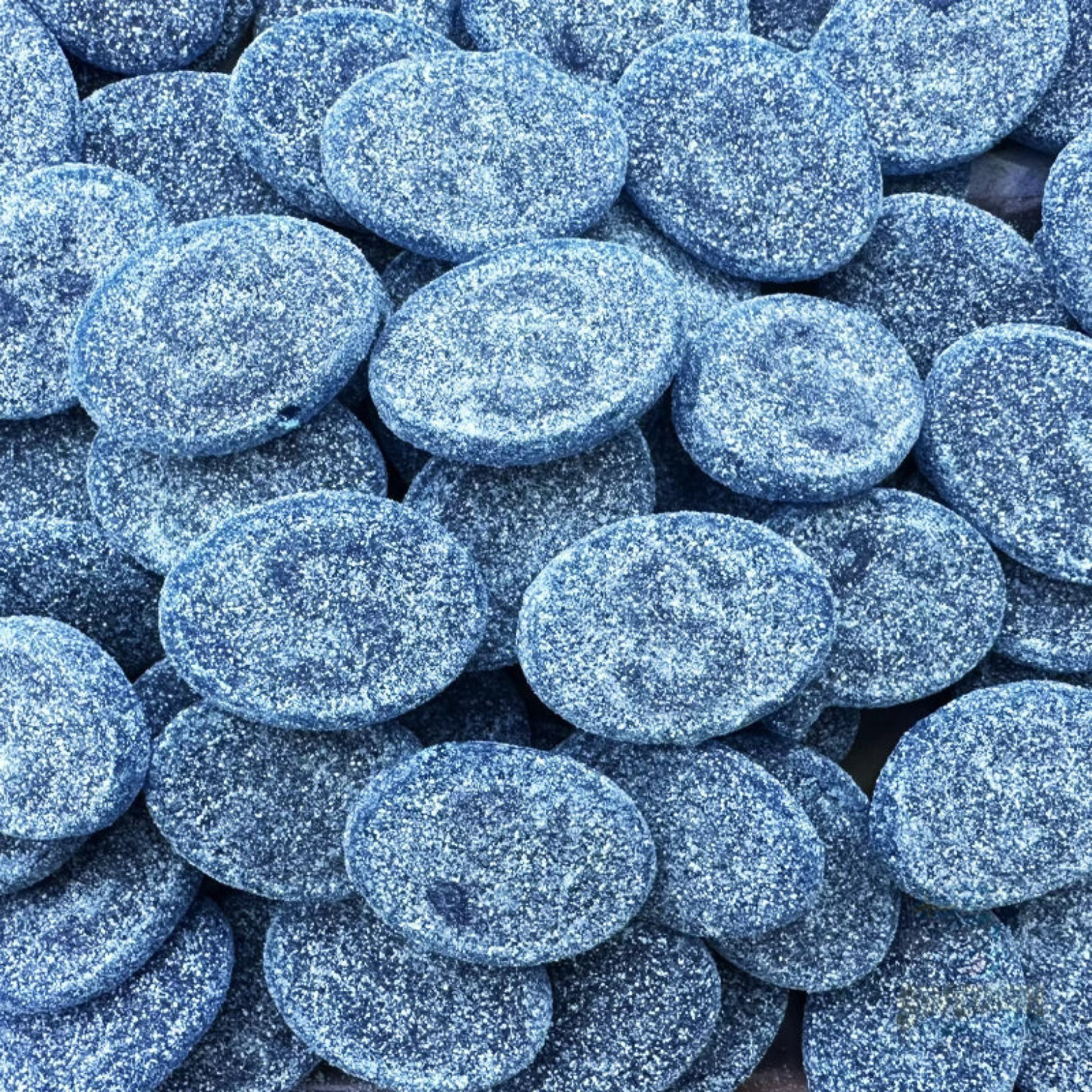 Syrliga blå hallongodisar – fruktiga, sega och syrliga med ett surt sockeröverdrag. Perfekt för godisälskare och fester.